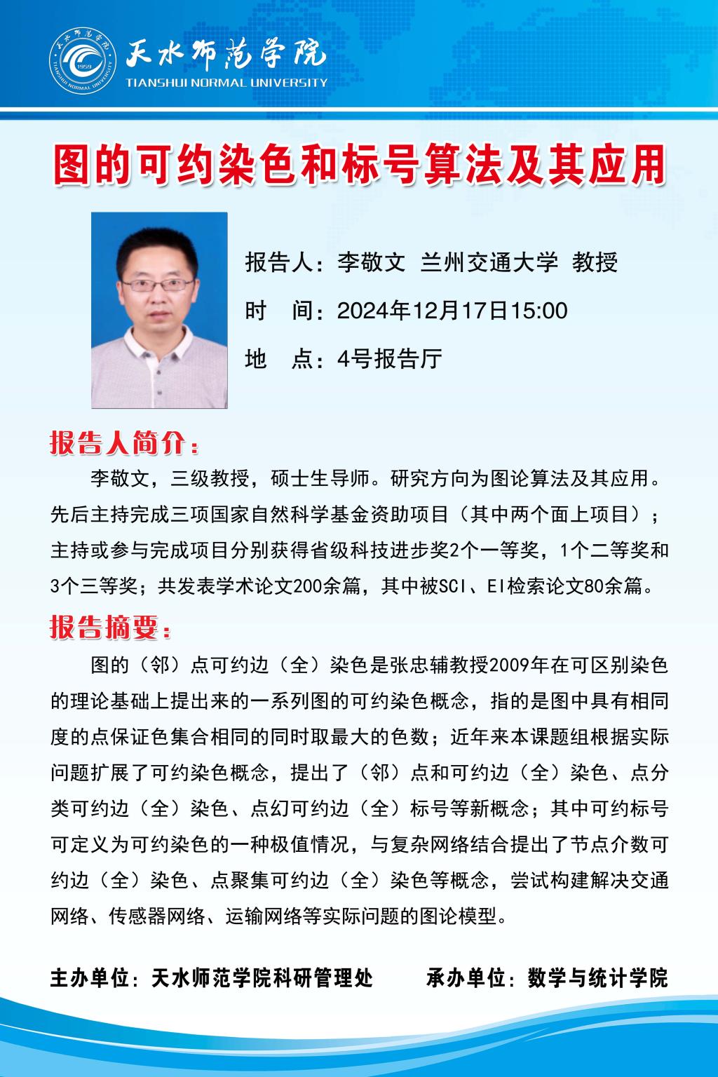 李敬文,三级教授,硕士生导师。研究方向为图论算法及其应用。先后主持完成三项国家自然科学基金资助项目(其中两个面上项目);主持或参与完成项目分别获得省级科技进步奖2个一等奖,1个二等奖和3个三等奖;共发表学术论文200余篇,其中被SCI、EI检索论文80余篇。