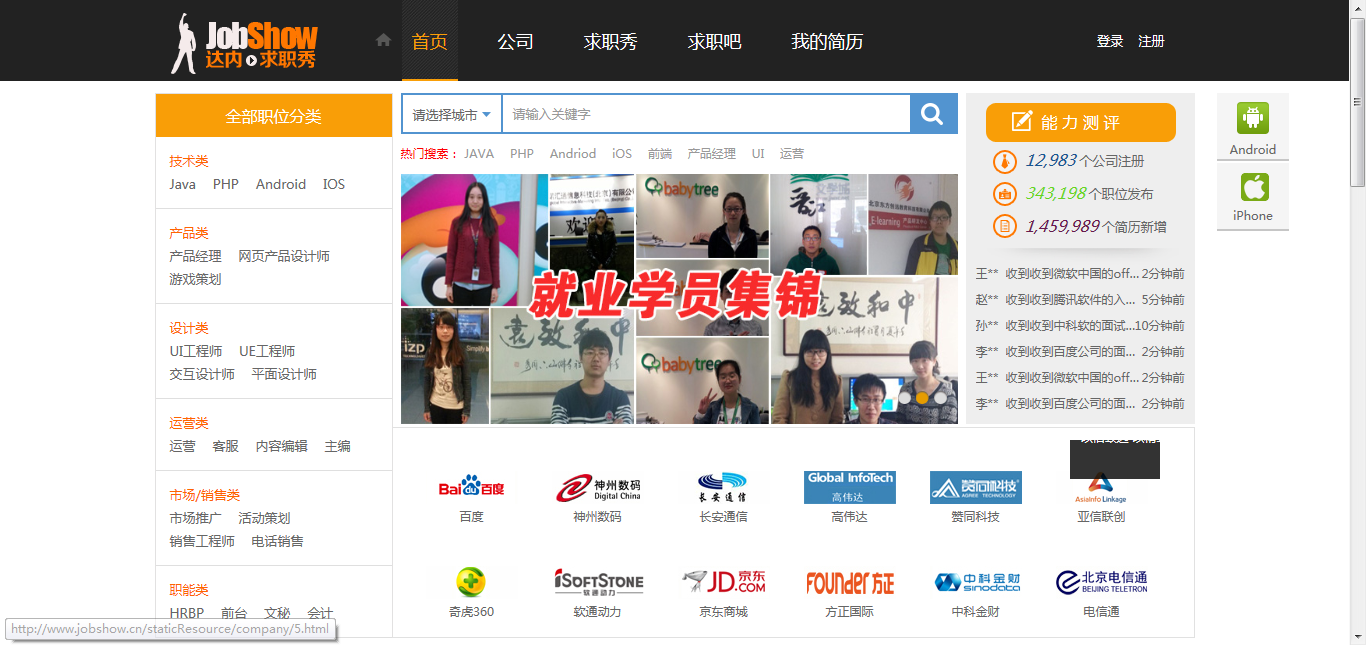 达内教育集团通过16年的努力,已与众多的世界一流公司(如IBM、微软、惠普、NEC、Yahoo、亚马逊、淘宝、三星电子、LG等)、国内一流名企(如腾讯、百度、京东、58同城、赶集网、神州数码、搜狐、新浪、亚信、金蝶、携程、当当、聪慧、中搜、分众等)达成广泛合作,拥有数量庞大的合作企业资源,达内集团可以充分借鉴合作企业资源为学员提供形式多样的就业推荐服务。
