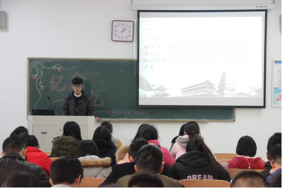 活动伊始,主持人介绍了“一二·九”运动的来源。80年前的今天,北平大中学生数千人举行了抗日救亡示威游行,反抗日本帝国主义,掀起了全国抗日救亡新高潮。给同学们播放的PPT和视频影片就是关于北平的热血青年是如何克服重重困难,种种压力,在天寒地冻的环境下撑起了民族的脊梁。同学们都专注于影片,眉头紧锁。主持人在讲解中与同学们互动,大家踊跃发言,表示要继承和发扬先烈的光荣传统,把爱祖国、爱学院体现到实际行动中去,我们虽然现在身处于和平年代,但我们仍然需要居安思危。活动中,由冯腾豫和承雪琴朗诵的“歌颂一二•九运动”的诗歌把本次主题班会提升到了高潮。