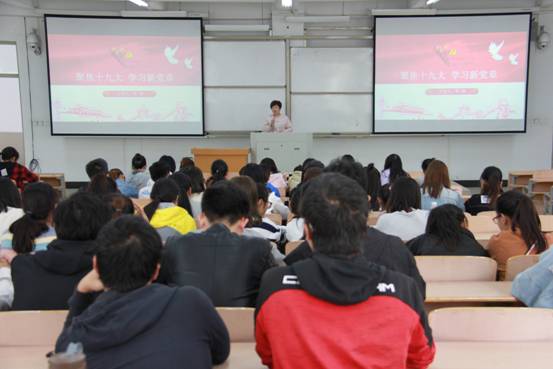 李琳从党章的地位和作用、十九大党章修改内容、党章主要内容解读等三个方面带领同学们回顾党章历史、把握党章内涵。她重点讲解了党的性质、指导思想和党员条件,强调习近平新时代中国特色社会主义思想立起了“新时代”思想旗帜。