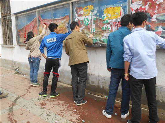 经过几个小时的认真清理,校园的面貌焕然一新,花坛以及道路重现整洁,昔日被广告贴得满满的墙面变得干干净净。虽然比较辛苦,但是大家看到自己的劳动成果,脸上都露出了满意的笑容。