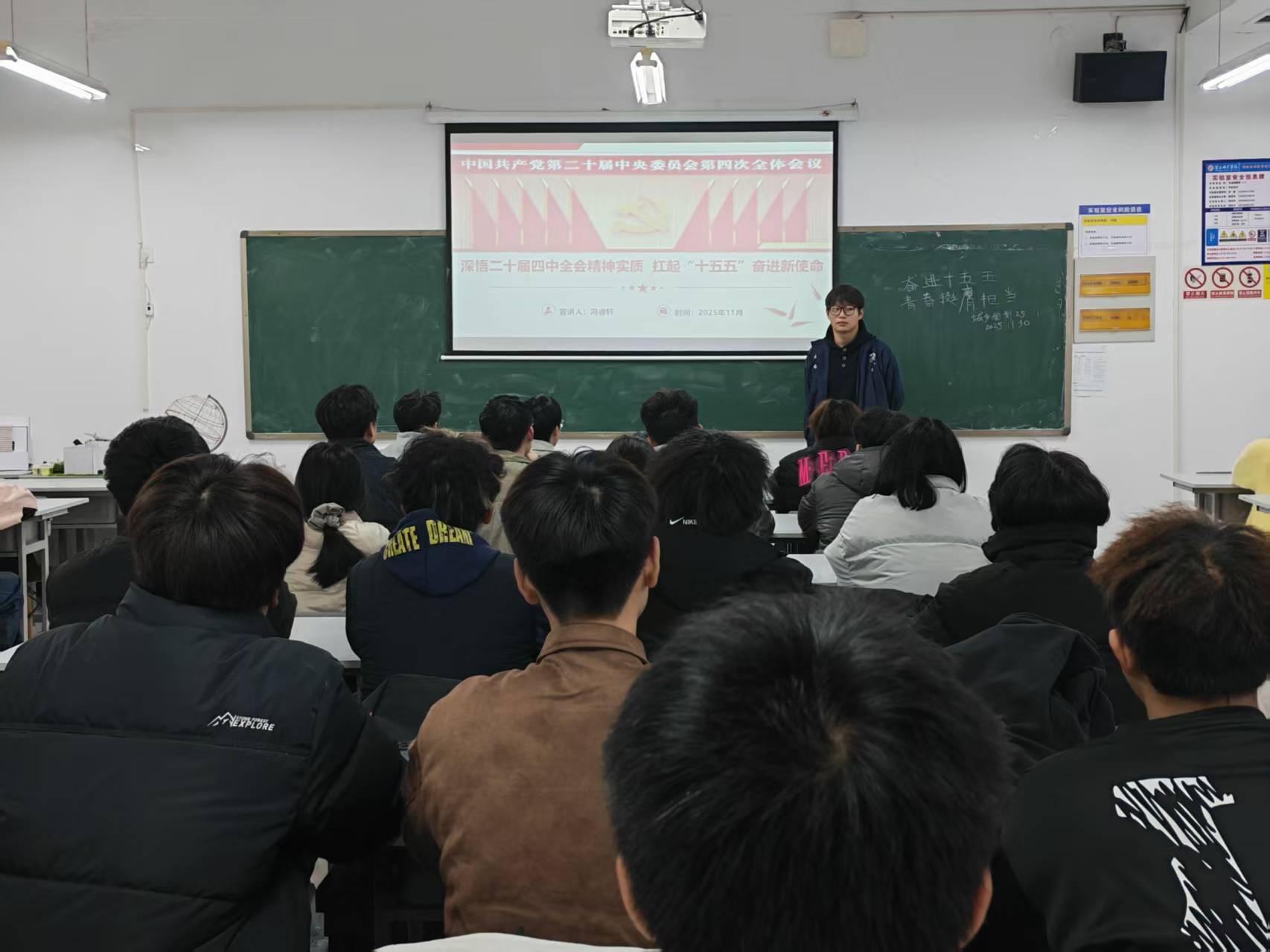 活动伊始,各团支部带领同学们齐唱共青团团歌,凝聚青春共识。随后,各支部负责人通过PPT授课、视频学习等形式,解读“十五五”规划目标,并结合专业特色深度阐释了高质量发展、美丽中国建设等核心要义。最后,同学们围绕“新时代青年如何为‘十五五’建功立业”展开讨论,一致认为应扎实锤炼专业本领,将专业能力转化为服务国家战略的实际行动。
