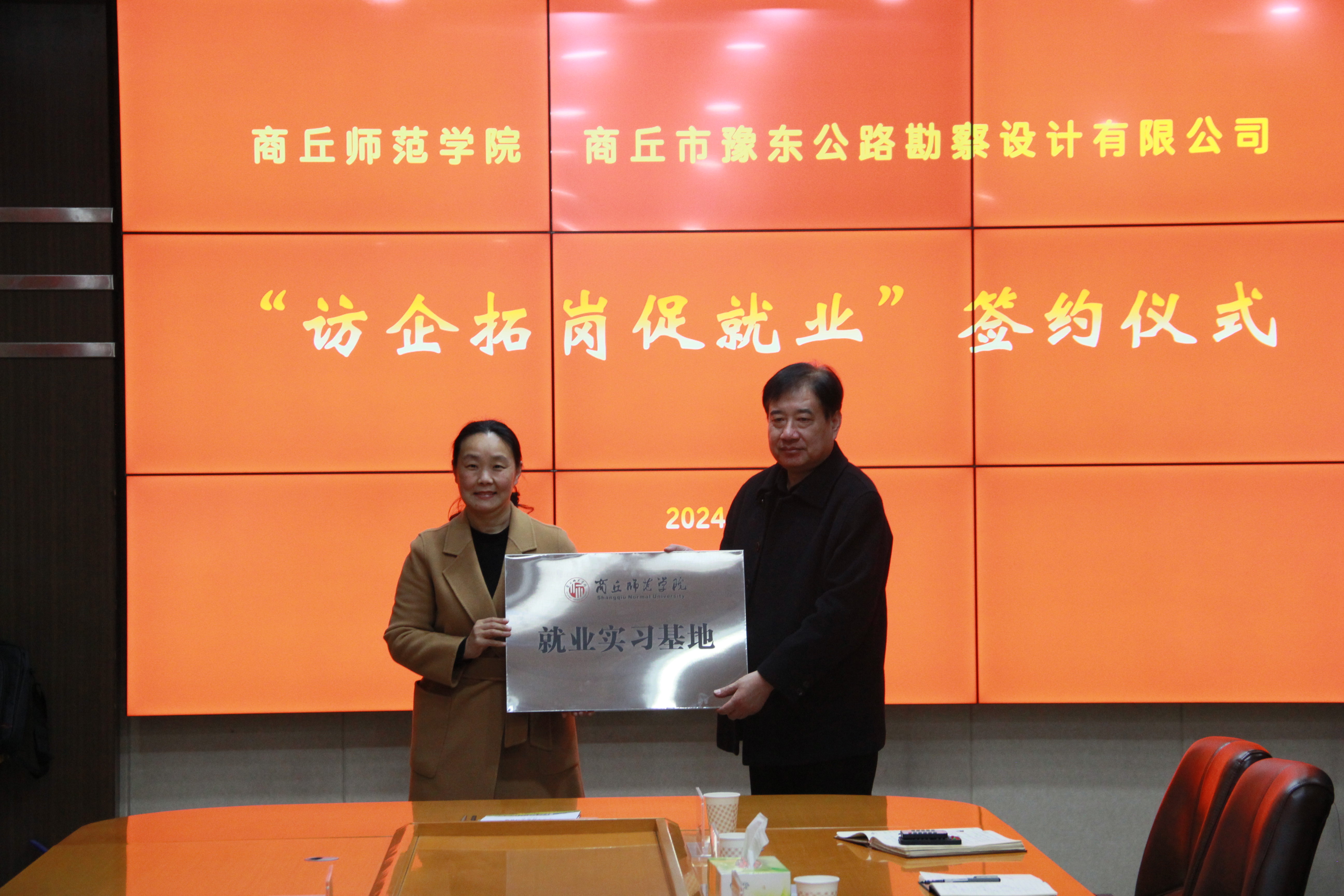 王晓征、华学礼分别代表beat365正版唯一官网和商丘市豫东公路勘察设计有限公司签署毕业生就业实习基地协议,并现场举行了就业实习基地授牌仪式。