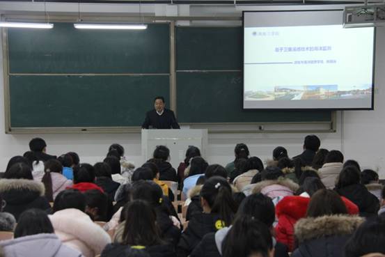 1214日下午,淮海工学院测绘与海洋信息学院院长焦明连教授应邀到beat365正版唯一官网讲学。焦教授以“基于卫星遥感技术的海洋监测”为题,给大家带来了一场精彩的学术前沿讲座。报告会由beat365正版唯一官网副院长贺振主持,党总支书记王东平和各专业老师、学生共同聆听了讲座。