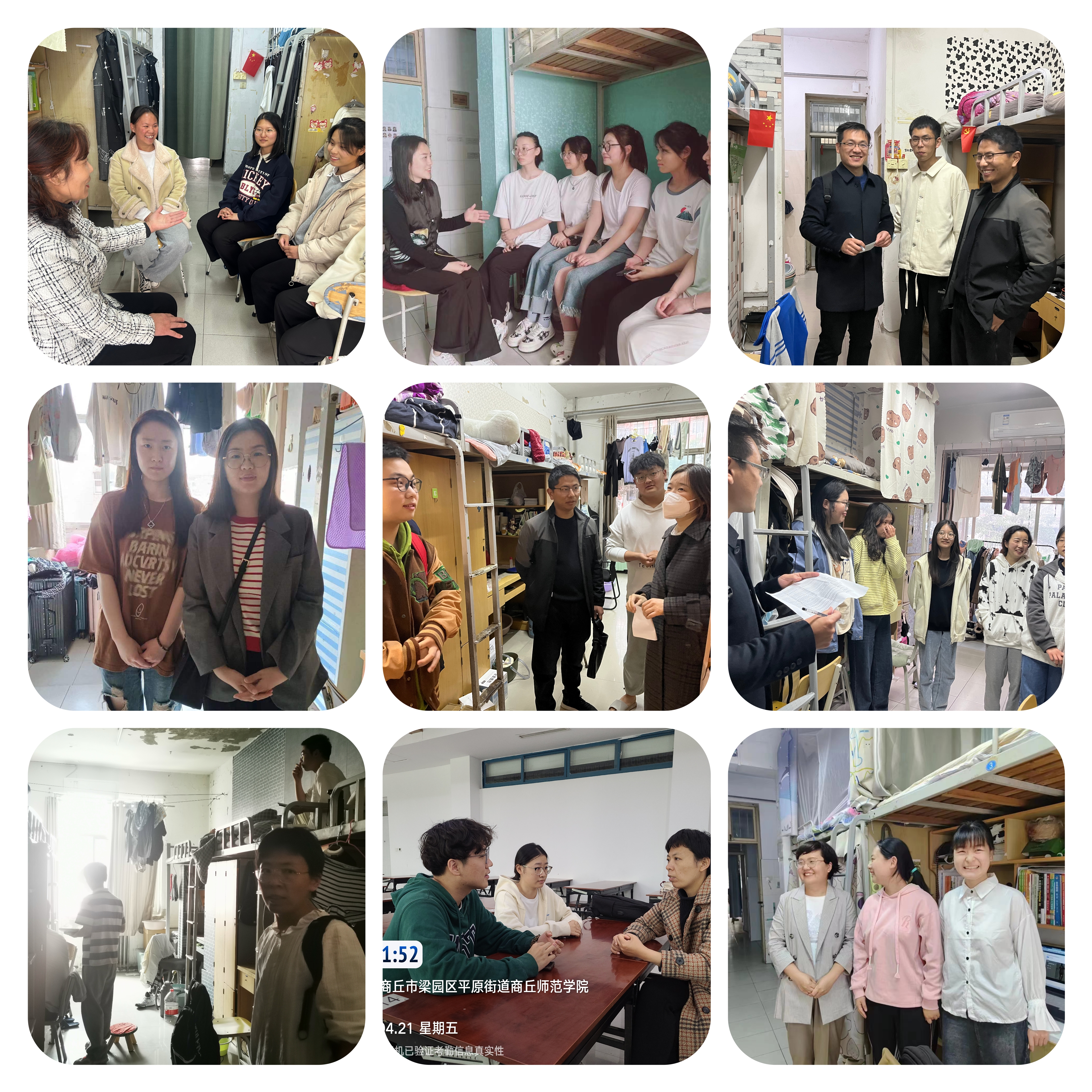 走访过程中,学院党委副书记王丽带领各年级辅导员、班主任深入学生宿舍,与同学们热烈交谈,深切关怀学生思想动态、考研就业情况、生活状态等,查看宿舍安全及卫生情况,并征求对学院工作的意见建议。同时,学工队伍深入班级,查看课堂及晚自习情况,走访过程中发现,学院各班级上课均能提前到教室预备,上课过程中秩序井然,课堂互动氛围良好。
