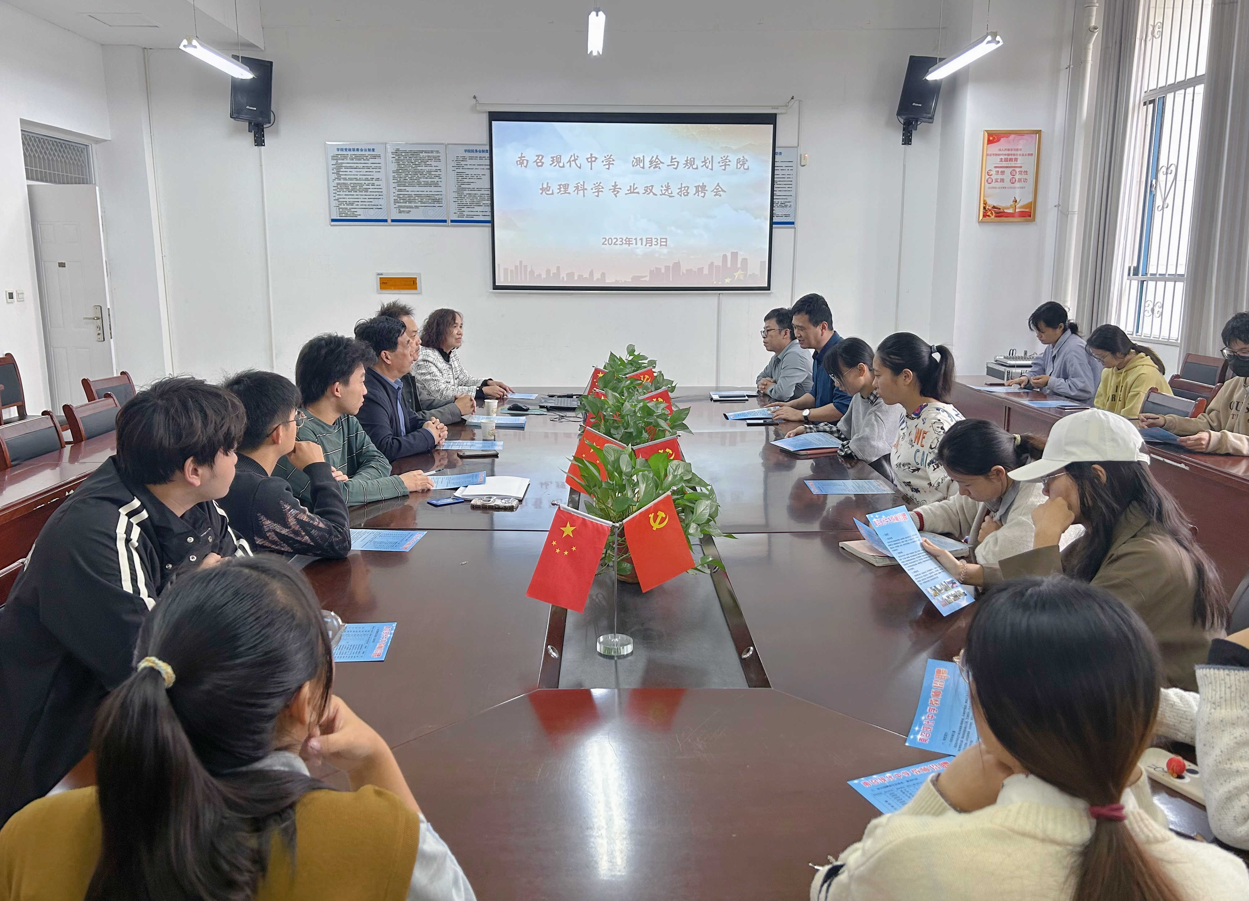 11月3日上午,beat365正版唯一官网于三商楼133会议室举办双选招聘会。南阳市南召现代中学校长孙庆功一行莅临beat365官网作招聘宣讲,beat365正版唯一官网党委书记时光、院长贺振和毕业班部分学生参加招聘会。
