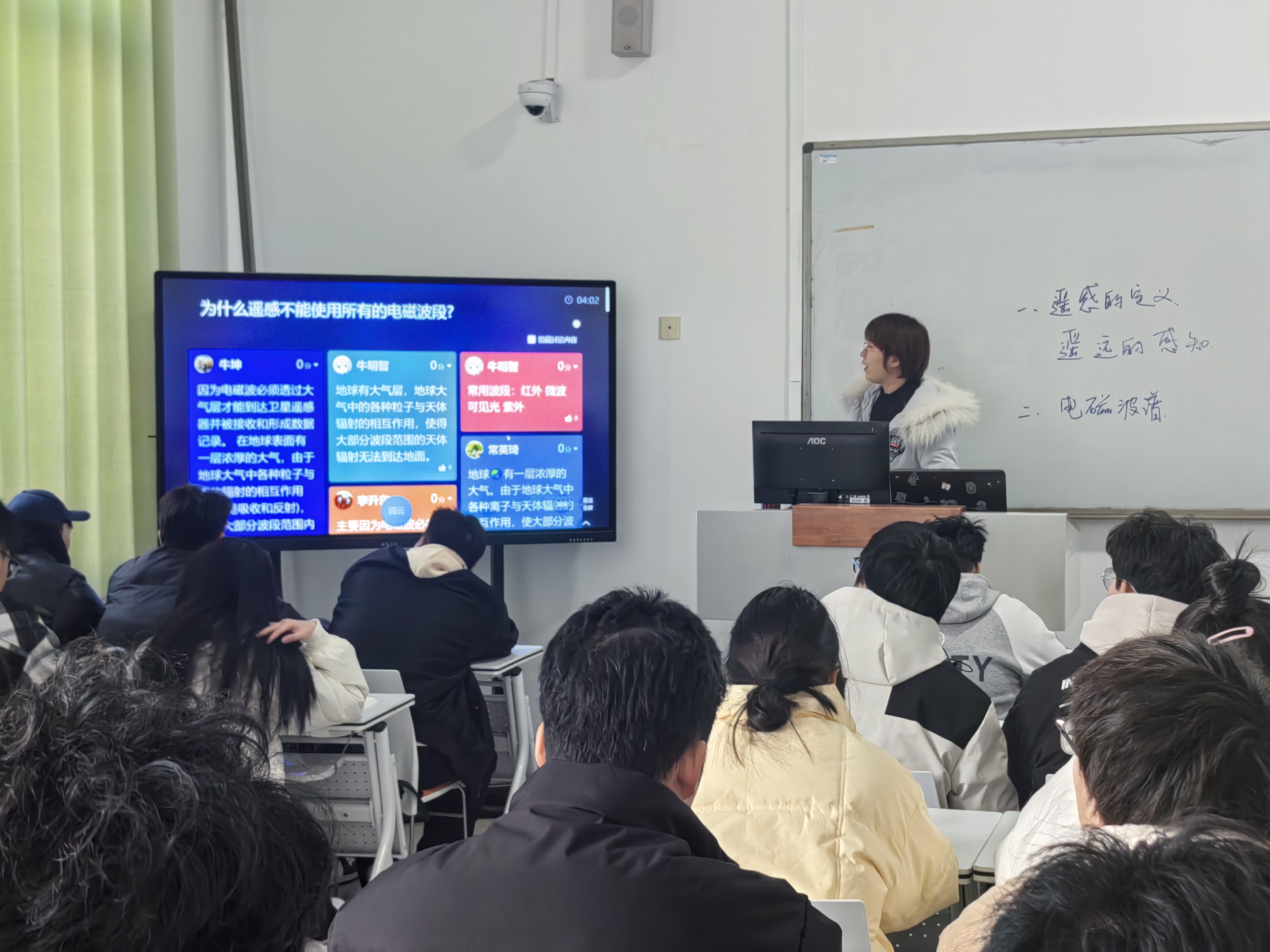 本节课讲授的内容是“遥感科学与技术”。课程开始,教师结合生活中的遥感,讲解遥感的基本概念,接着从遥感的概念进行深入讲解。在讲解第一个重点内容“遥感的电磁波”时,主要采用小组协作的方法:基于课前的预习,小组讨论“为什么在遥感中没有使用所有的电磁波?”,接着由小组同学通过学习通进行回答,最后由教师进行补充讲解。在讲解第二个重点内容“遥感平台”时,采用小组汇报的方法:学生课前通过查阅资料,制作了相关内容的ppt,在课堂上进行汇报,教师最后进行总结。