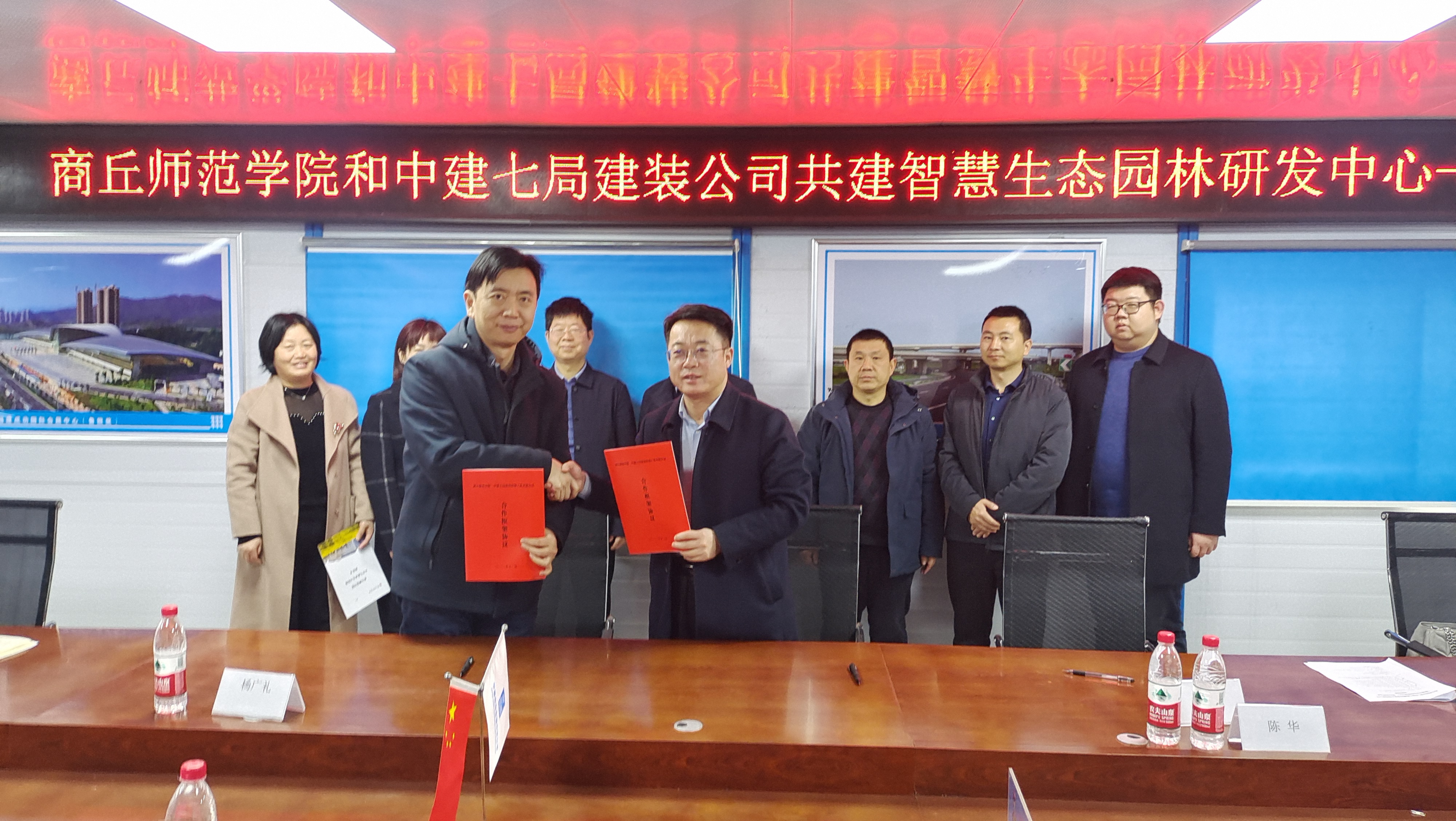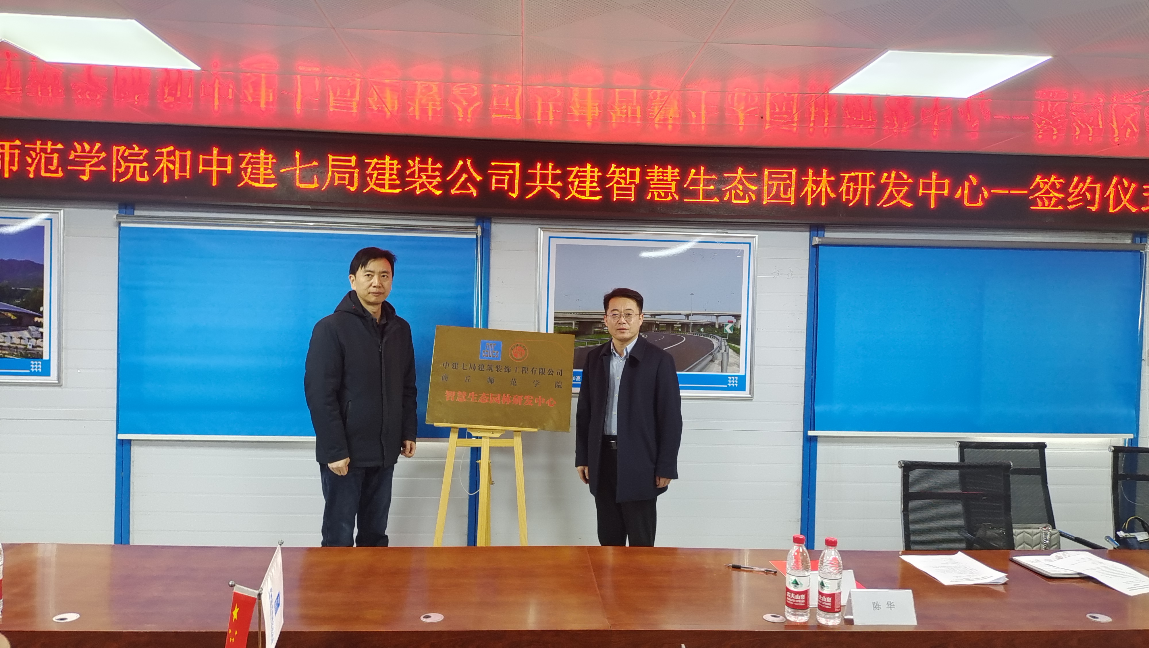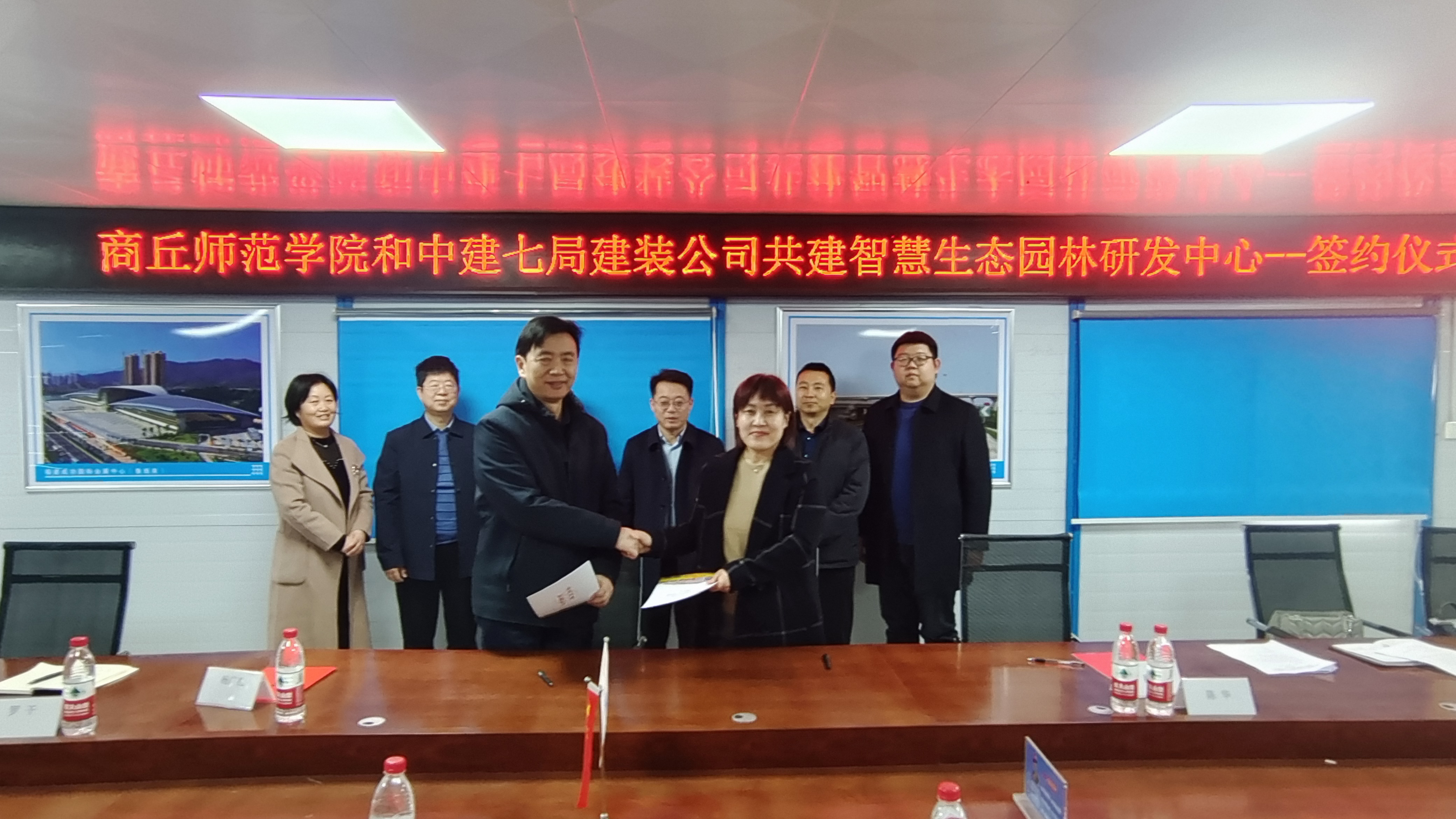 3月6日,beat365官网与中建七局建筑装饰工程有限公司举行合作共建“智慧生态园林研发中心”签约仪式暨访企拓岗活动。副校长翟滨出席签约仪式。