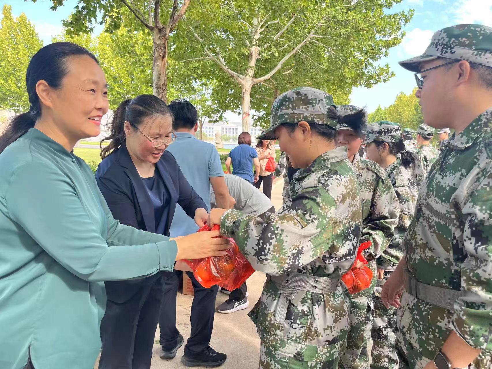 在新生军训现场,王晓征亲切慰问了承训教官,感谢他们为新生军训工作所付出的辛勤努力,并勉励新生们要珍惜军训时光,将军训中培养出的纪律性、团结精神和坚韧不拔的意志品质带入到未来的学习和生活中去,不断磨砺不断成长。随后,王晓征一行来到了医疗保障点,详细询问了医疗物资储备和应急处理流程,并对医护人员的工作给予了充分肯定,对大家的辛勤付出表示感谢。最后,王晓征为军训教官、24级新生及医疗保障人员发放了月饼、牛奶、水果等“中秋大礼包”。