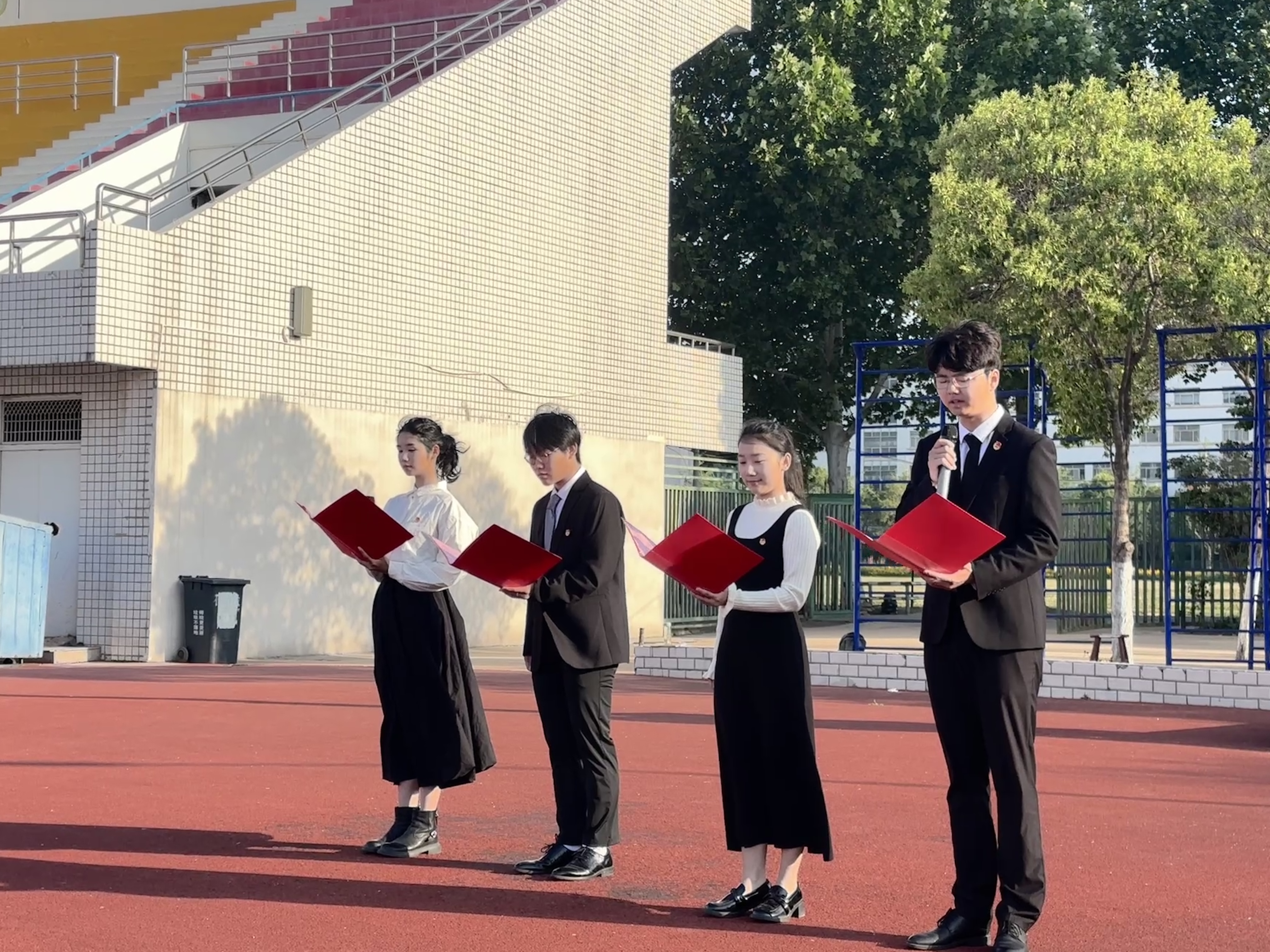 上午七时,升旗仪式正式开始,在全体师生的注目下,国旗班迈着铿锵步伐护卫国旗入场。伴随着雄壮的《义勇军进行曲》,五星红旗冉冉升起。随后,2023级地理科学(公费)班学生代表深情朗诵《师德颂——因为我是一个老师》,以抑扬顿挫的声韵诉说教育初心,用“甘作春泥护桃李,愿为星火照山河”的誓言,展现师范生扎根教育、服务家国的青春志向。