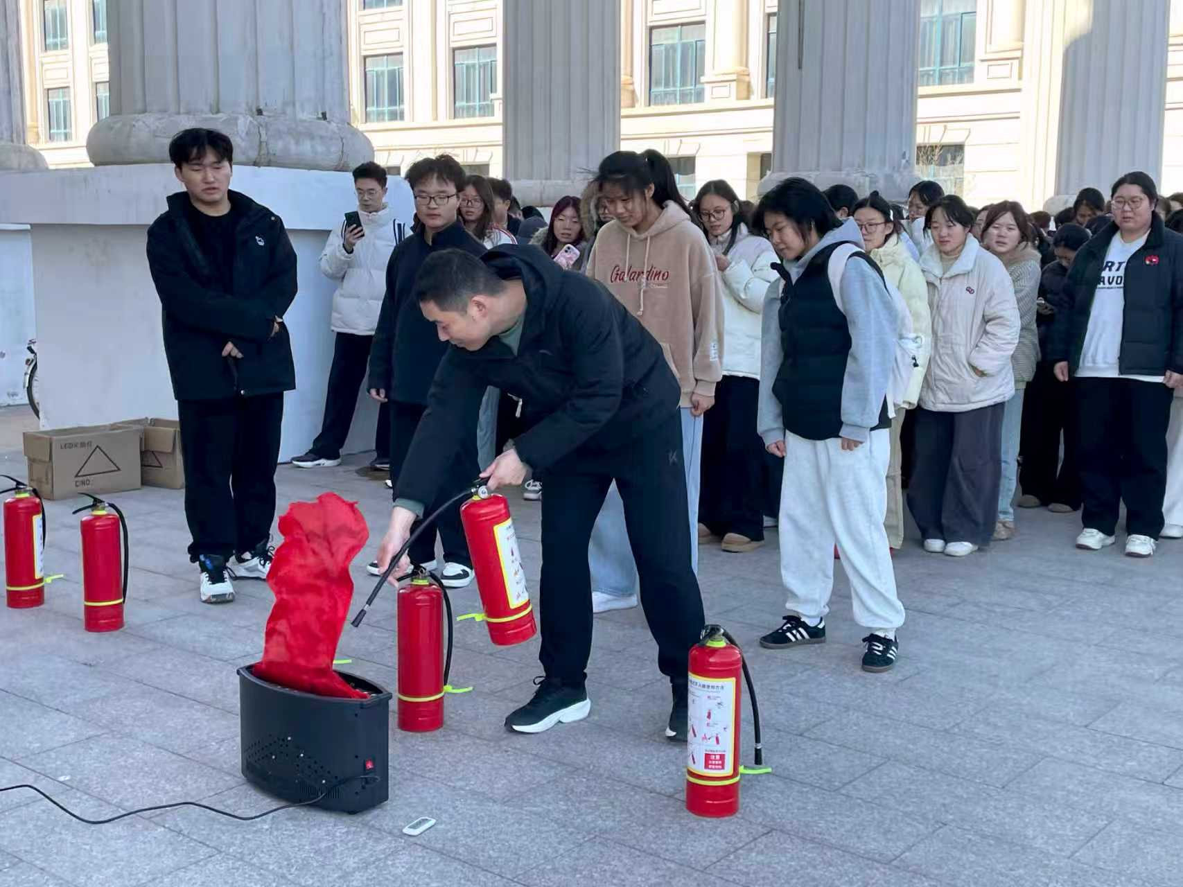 活动伊始,张瑞杰结合校园火灾典型案例,系统讲解了火灾成因、火灾类型划分及各类消防器材的适用场景与操作规范。在实操环节,他示范了灭火器“提、拔、握、压”的标准流程,随后指导学生们逐一上手演练。同学们在灭火体验中掌握了基本技能,既深化了对消防知识的认知,也提升了应急处置火灾险情的信心与实操能力。