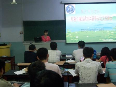 2008年6月10日,环境与规划系08届毕业论文答辩会在3#教学楼举行。地理科学专业08届毕业生50人参加答辩,答辩会按论文属性分两个小组同时进行,一组答辩老师包括史本林教授(系答辩委员会主席)、余方镇教授、贺振博士和范况生老师,二组答辩老师包括张卫星教授(系答辩委员会副主席)、李学鑫博士、王贵成博士和李红忠老师。
