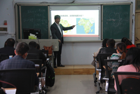 课堂开始,袁孝亭教授先向学员们提出“初中地理教学的主要内容”这一问题,并以此引出“怎么看地理位置”和“怎么看地理分布”这两大课题。随后,他从多个角度向学员们详细明晰地讲解例题、补充知识点并向学员们介绍了认知地理位置和地理分布的四种方法。一是区域划块结合方位进行地理描述;二是借助参照物,用方位名词对位置和分布进行概括和描述;三是注意地理分布的形状识别与归纳;四是整体扫描、局部聚焦的读图方法。接着,袁孝亭对数个国家的地理位置和地理分布进行现场分析,进一步加深了学员们对这四种方法的理解和应用。他指出,地理学科的教学和学习要有一定的逻辑方法,老师要引导学生有“形状”敏感度,逐步完成从死记硬背到理解记忆的转变。最后,他强调,学习一定要进行大量的文献阅读与学理分析,要带着问题深入阅读,从“读”中“悟”出答案,然后“转”化为学习方法。
