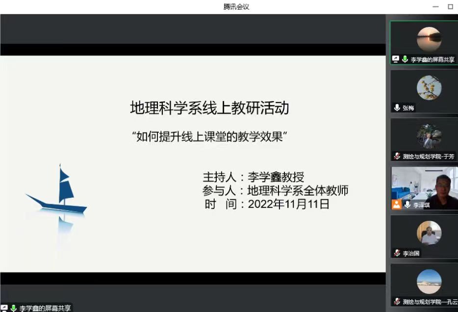 2022年11月11日上午,beat365正版唯一官网地理科学系召开了“如何提升线上教学效果”专题教研活动会议。会议由系主任李学鑫教授主持,采用线上腾讯会议形式进行,地理科学系全体教师参加。
