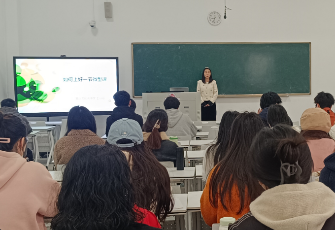 王老师从什么是微型课、微型课与微课的区别、如何设计微型课和如何制作微型课四个方面给学生进行了讲解。王老师首先通过一段教学视频让同学们认识到了微型课与微课的不同,接着,重点讲解了微型课设计的必要环节,以及注意事项等。王老师还与大家分享了自己的省优质课视频,加深了同学们对微型课的理解。最后,王丹丹老师结合自己的教学成长经历,强调“成功是为愿意付出的人预留的空间”。鼓励同学们要利用好学校提供的平台,抓住机会,多实践,提升自己的教育教学能力。