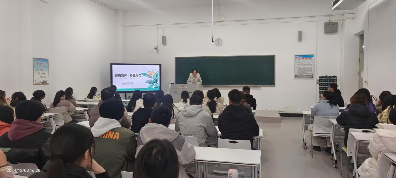 讲座伊始,王冕老师首先强调了教师职业的特殊性和重要性。她指出,教师是人类灵魂的工程师,肩负着立德树人的神圣使命,教师的师德师风直接影响着学生的成长成才,关系着国家和民族的未来。接着,王冕老师详细阐述了“四有好老师”的标准。她结合自身经历,分享了如何在教育实践中坚守教育理想,鼓励未来的教师们要将个人理想与国家发展、民族复兴紧密结合;随后,她列举了教育实践中的具体案例,阐述了如何处理师生关系、同事关系以及与家长之间的关系;与此同时,她强调,一名合格的教师必须具备扎实的专业知识和广博的文化素养,不断学习,更新知识,努力成为学生的学习榜样。