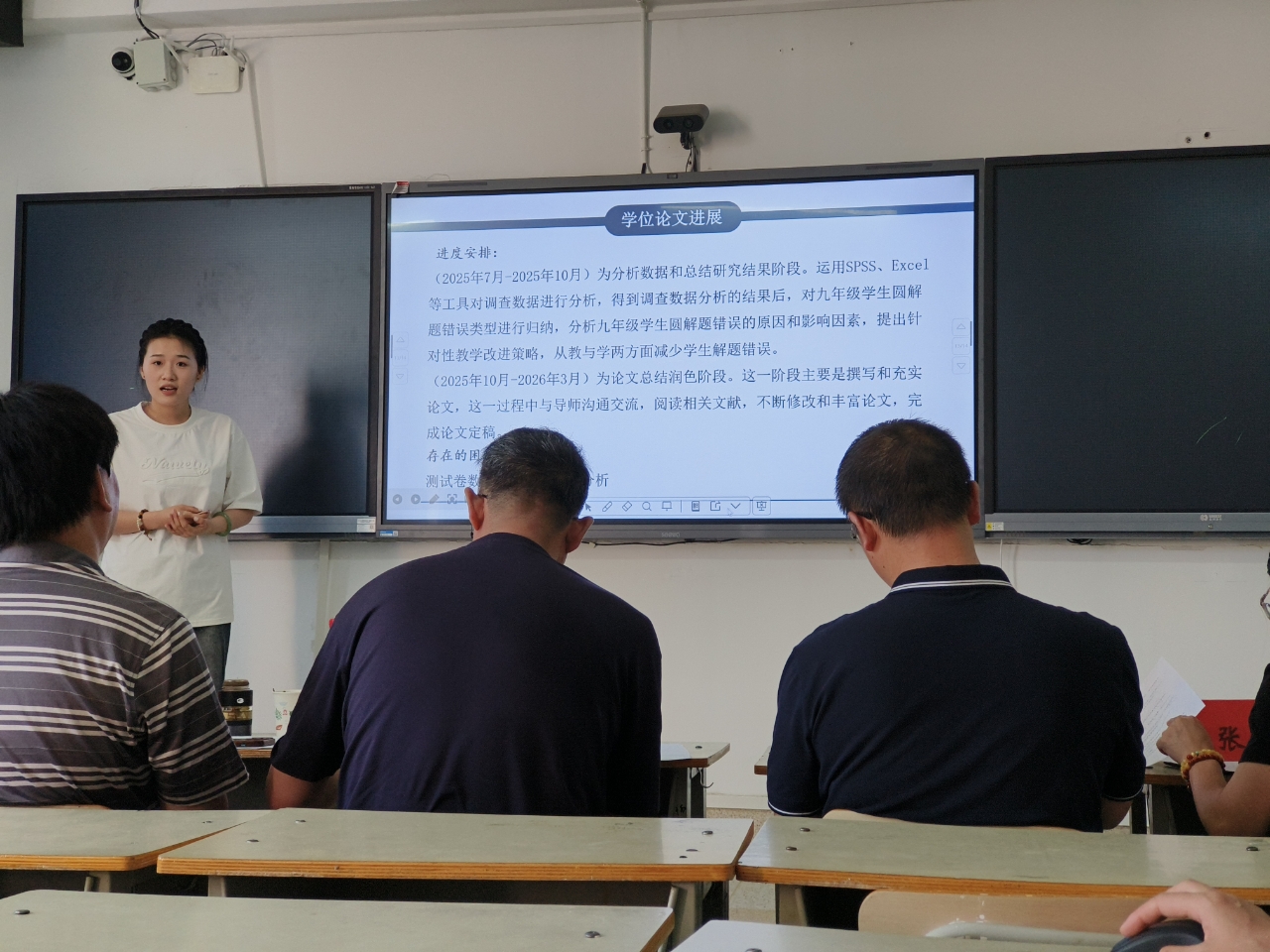 考核分填写中期考核登记表和开展中期考核答辩两个阶段进行。在考核答辩中,研究生针对课程学习、教育实习、教育实践以及学位论文进展等四个方面的内容进行汇报。考汇报结束后,考核小组对汇报内容进行了全面的评议,尤其是对学位论文开展过程中出现的问题进行了专业点评并提出了建设性的修改意见。