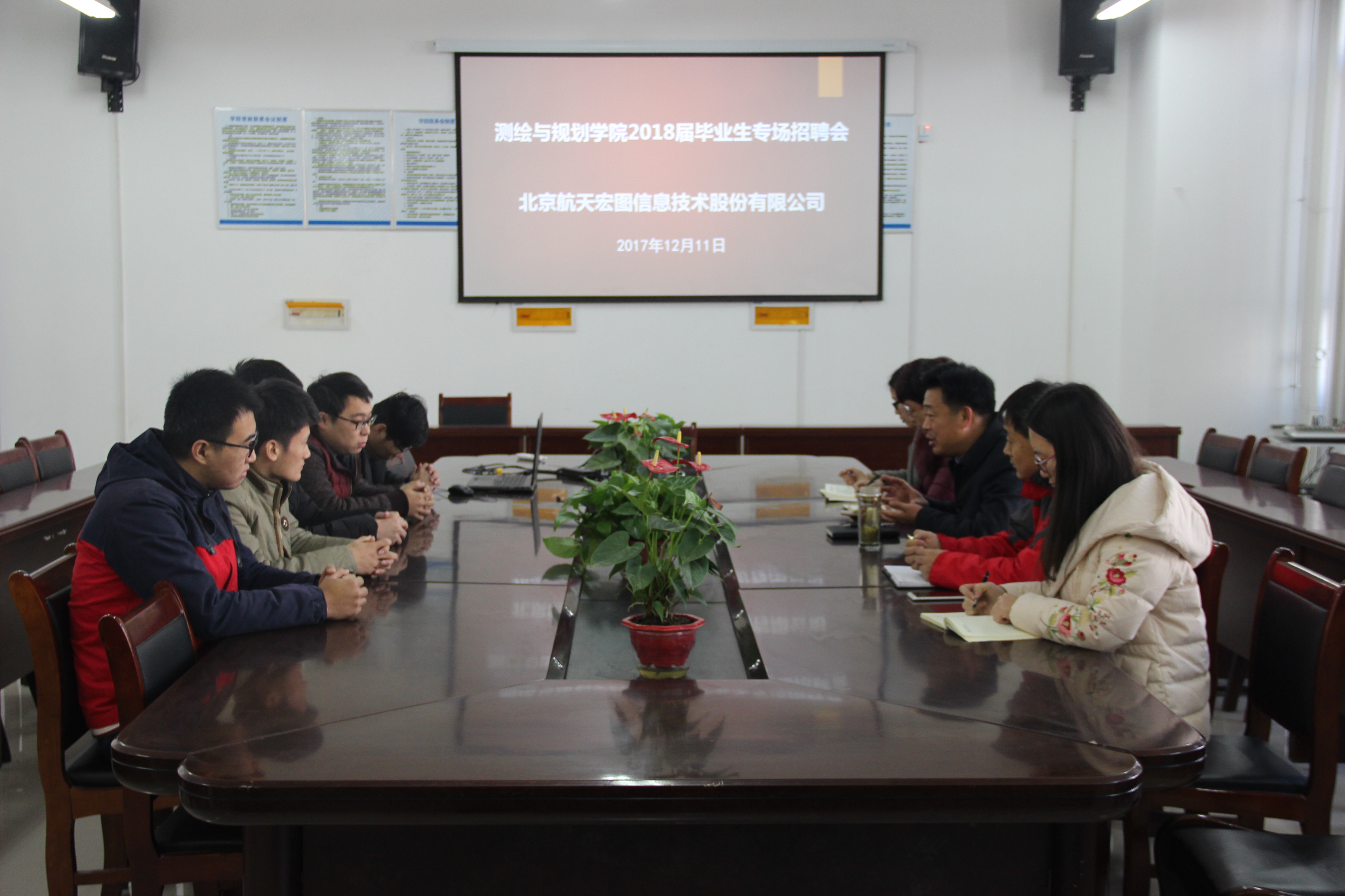 12月11日上午,北京航天宏图信息技术股份有限公司郝经理一行到beat365正版唯一官网举行专场招聘会。beat365正版唯一官网党总支书记王东平、副书记李琳、团总支书记路璐、就业专员魏理、毕业生辅导员寇亚莉出席本次招聘会。会议由王东平书记主持。