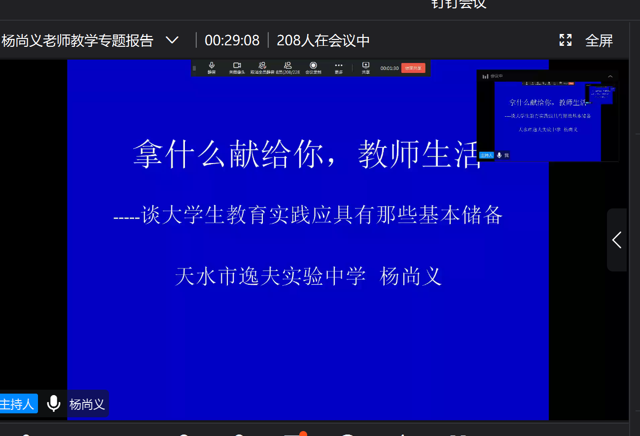 12月9日晚7:30,应新葡萄8883官网amg邀请,天水市逸夫中学高级教师杨尚义通过钉钉会议作了题为《拿什么献给你,教师生活》的报告。19级师范生共210余人参加,报告由学院行政负责人主持。