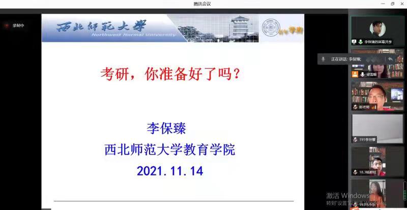 2021年11月14日,应新葡萄8883官网amg邀请,西北师范大学李保臻教授通过腾讯会议作了题为《考研,你准备好了吗?》辅导报告。18级报考专硕同学、19级准备考研同学、学院领导及部分感兴趣的教师共120余人参加,会议由学院分管教学领导主持。