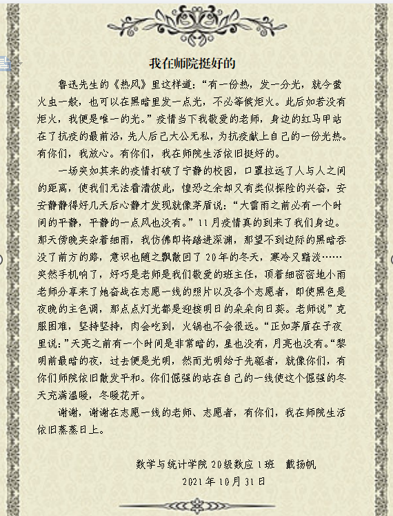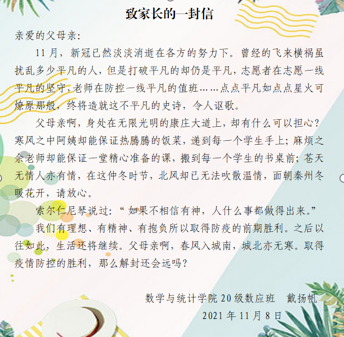 家长理解、支持,学生亦配合学校疫情防控管理规定,在封闭管理期间。戴扬帆同学积极响应学院号召,主动参与学生思想文化建设活动,主动与同学谈心谈话,化解同学们的焦虑情绪,动员同学们尽量克服生活中的小困难,遵守学校疫情防控期间封闭管理规定和线上教学管理规定,先后撰写了《我在师院挺好的》和《致家长的一封信》。