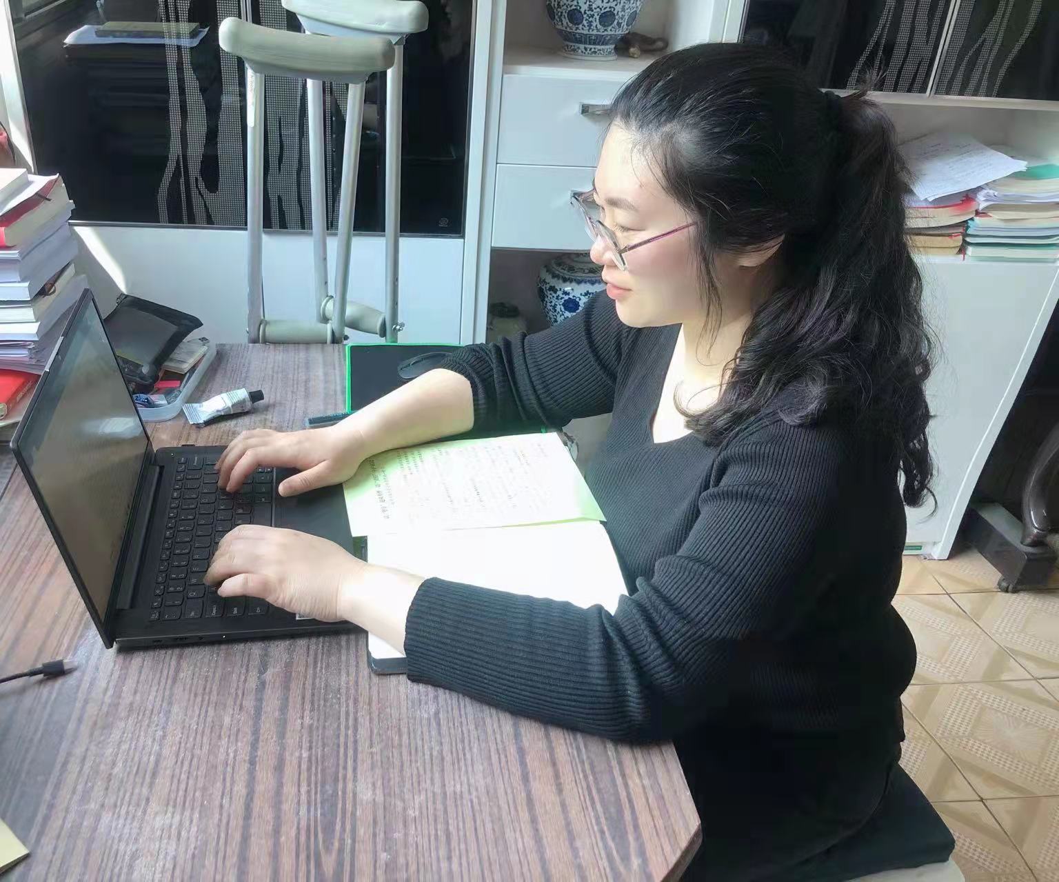 年初,由于意外,李佳老师的脚骨折了。突逢疫情来袭,她本人也被隔离在家。虽然不能返校,但她的心里,放不下工作,放不下学生们。拄着拐,从卧室到书房,就是她的两点一线,书房就是她的办公室,线上办公,电子平台就是她的新战场。她从不同的层面,想办法、用心思开展学生工作。通过微信群、腾讯会议等迅速启动、高效开展学生动态摸排工作。通过微信等线上平台引导学生关注疫情,带头做防控知识的传播者、疫情谣言的制止者、健康校园的守护者。她多次线上组织召开党员大会,安排党员值班,建立党员先锋队,开展动员大会引导每位学生党员牢固树立“人民至上、生命至上、安全至上”的思维理念,以向党、向国家、向人民高度负责的担当态度,勇敢扛起“坚守”的政治任务,做好党员志愿服务,坚决打好疫情攻坚战。