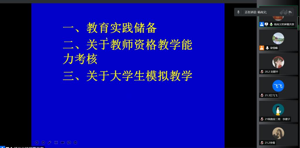 7月8日晚7:30,应新葡萄8883官网amg邀请,天水市逸夫实验中学杨尚义老师通过腾讯会议在线作了题为《拿什么献给你,教师生活—谈大学生教育实践应具有哪些基本的储备》的专题报告,学院部分教师、数学与应用数学专业20级、21级学生共300余人参加。