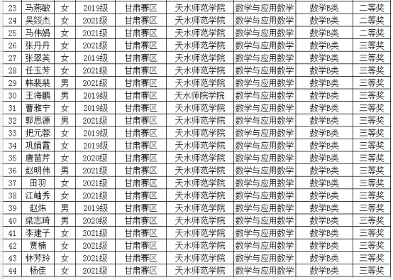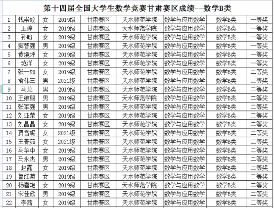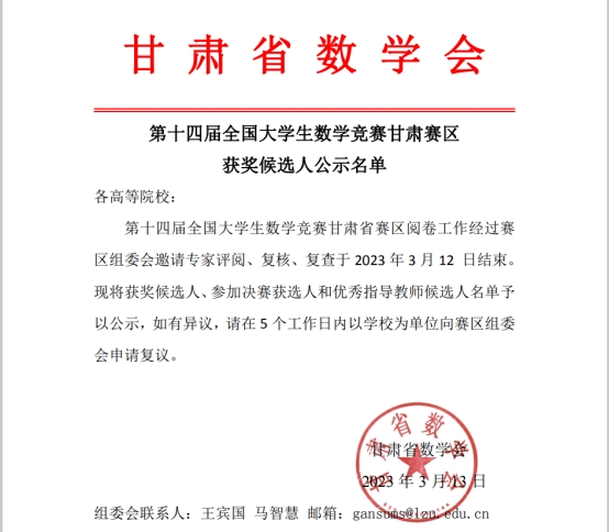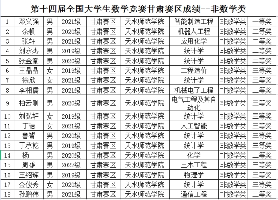 由中国数学会主办的2023年第十四届全国大学生数学竞赛(甘肃赛区)获奖名单近日揭晓。新葡萄官网有62名同学喜获佳绩。数学专业B组获奖44项,其中一等奖6项,二等奖19项,三等奖19项;非数学专业获一等奖1项,二等奖4项,三等奖13项,共18项。数统学院2019级学生钱崇姣获数学专业B组第三名,机电学院2021级学生邓义强获非数学专业第7名,两人将代表甘肃赛区参加全国大学生数学竞赛决赛。