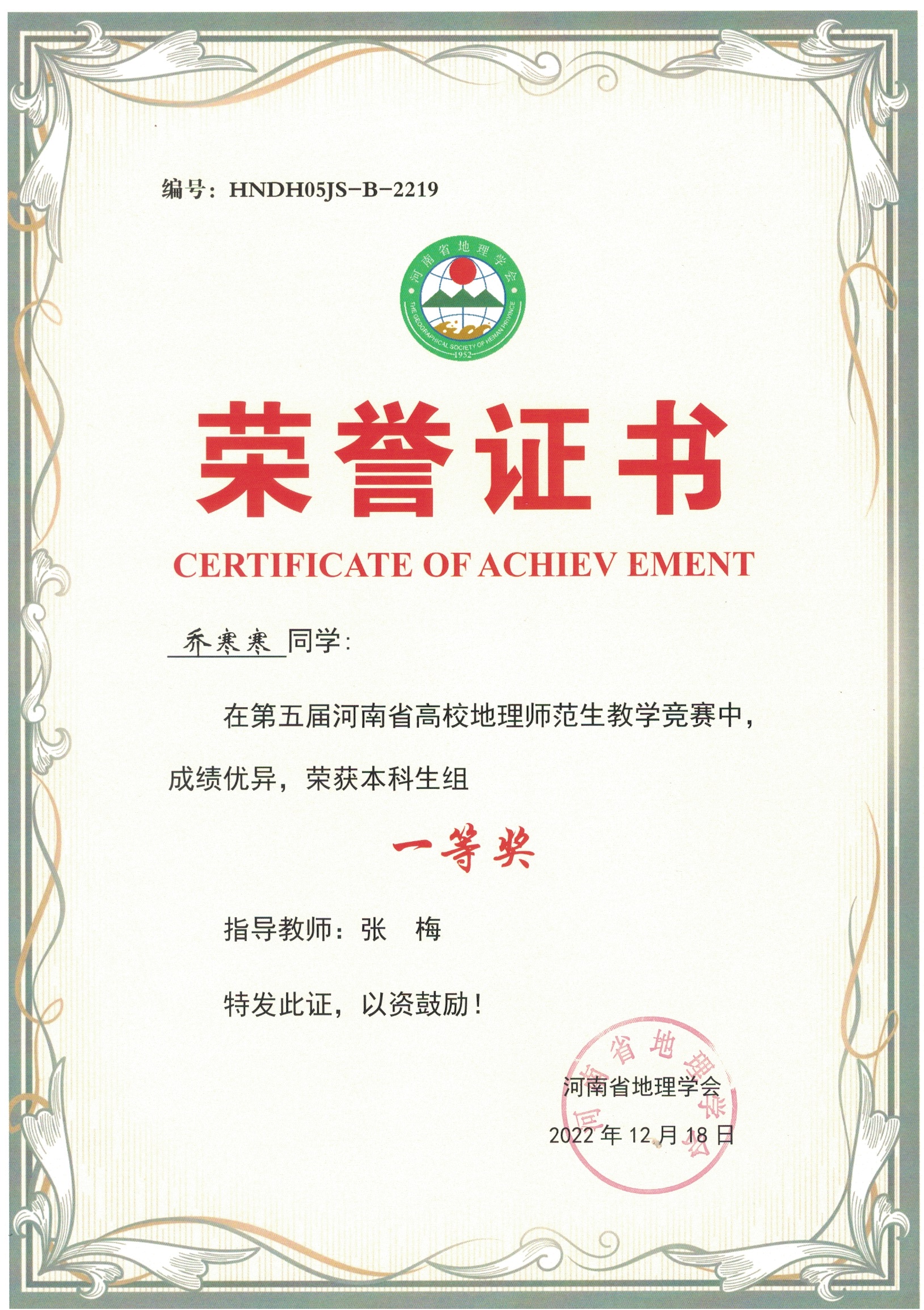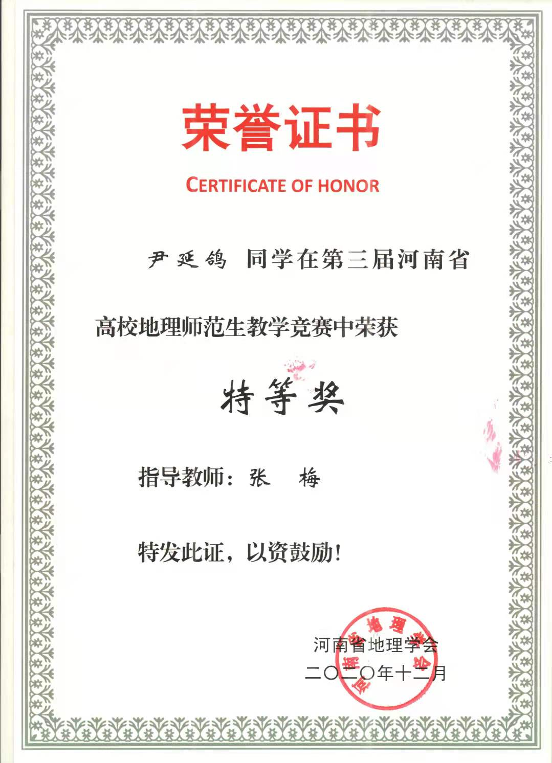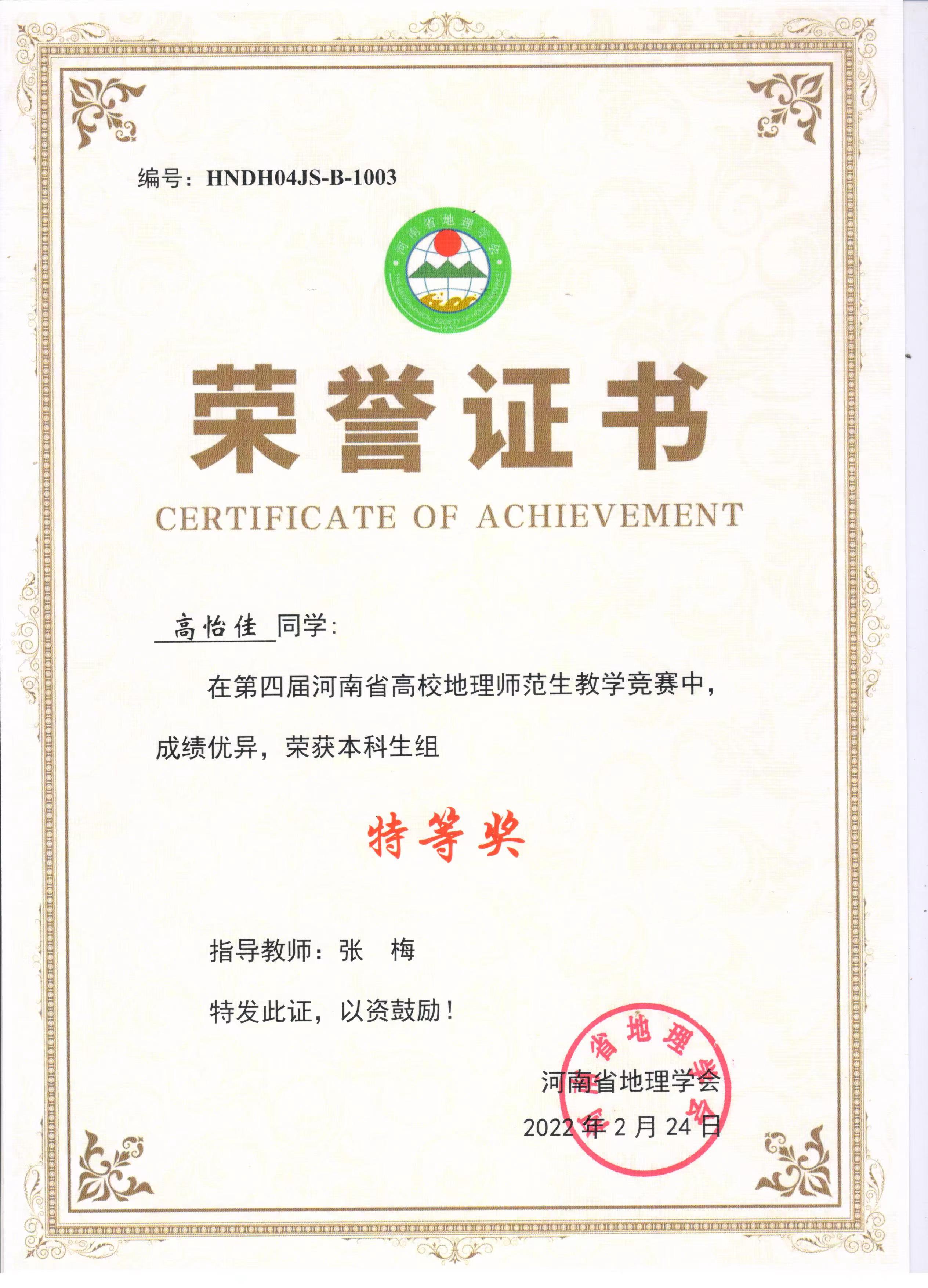 学生参加河南省地理学会师范生教学技能竞赛获奖情况